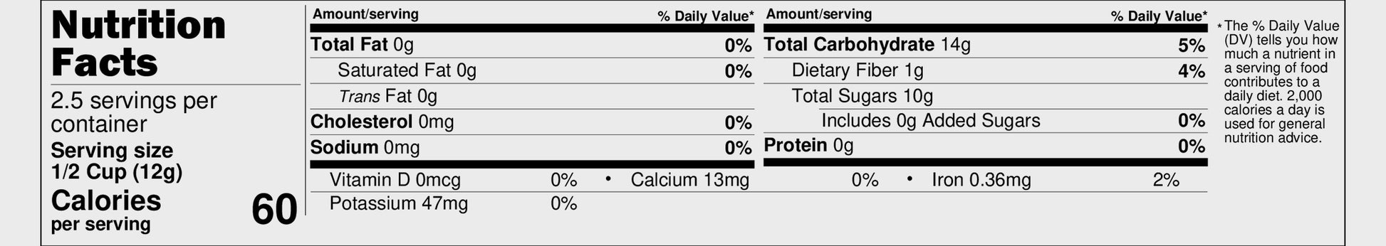 The freeze-drying process preserves about 97% of the nutritional value of fresh fruit, ensuring you get all the benefits while enjoying a longer shelf life compared to other preservation methods like canning or dehydrating. The intense flavour, aroma, colour, shape, and texture of the mangos remain intact, making them a delightful and nutritious choice!